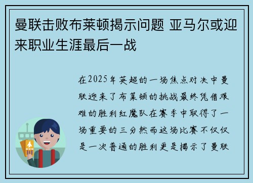 本文将深入探讨《球场风云:于帕的转变与蜕变》这一主题,分析球员于帕在职业生涯中经历的多次转变和蜕变。文章将从四个主要方面进行详细阐述,分别为“成长的烦恼与挑战”、“技术的突破与转型”、“心理素质的提升与磨砺”以及“团队与个人的平衡”。每个方面通过具体的比赛、事件和数据分析,展现了于帕如何从一名青涩的...